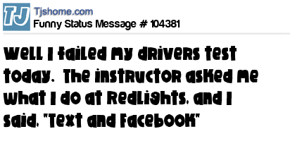 X Well I failed my drivers test today. The instructor asked me what I do at Redlights, and I said, "Text and Facebook"