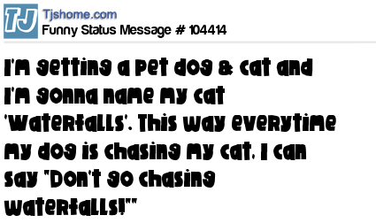 X is I'm getting a pet dog & cat and I'm gonna name my cat 'Waterfalls'. This way everytime my dog is chasing my cat, I can say "Don't go chasing waterfalls!""