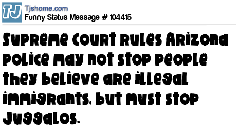 X says Supreme Court rules Arizona police may not stop people they believe are illegal immigrants, but must stop Juggalos.