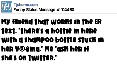 X says My friend that works in the ER text. "there's a hottie in here with a shampoo bottle stuck in her V@gina." Me "ask her if she's on Twitter."