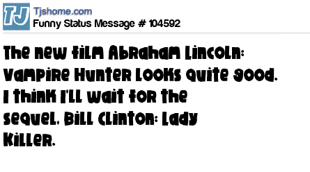 X The new film Abraham Lincoln: Vampire Hunter looks quite good. I think I'll wait for the sequel, Bill Clinton: Lady Killer.