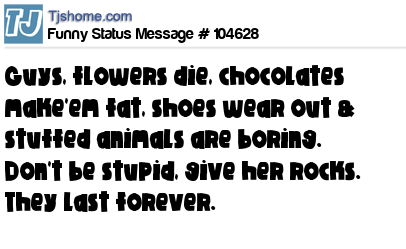 X says Guys, flowers die, chocolates make'em fat, shoes wear out & stuffed animals are boring. Don't be stupid, give her rocks. They last forever.