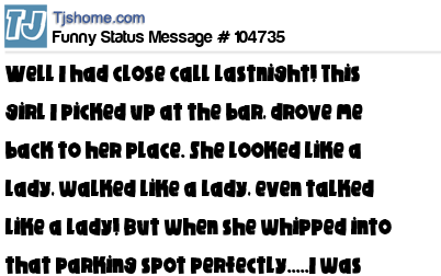 X is Well I had close call lastnight! This girl I picked up at the bar, drove me back to her place. She looked like a lady, walked like a lady, even talked like a lady! But when she whipped into that parking spot perfectly.....I was like hold on somethings up!