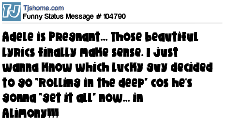 X Adele is Pregnant... Those beautiful lyrics finally make sense. I just wanna know which lucky guy decided to go "Rolling in the deep" cos he's gonna "get it all" now... in Alimony!!!