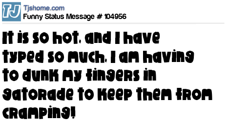 X says It is so hot, and I have typed so much, I am having to dunk my fingers in gatorade to keep them from cramping!