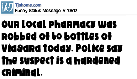 X Our local pharmacy was robbed of 60 bottles of Viagara today. Police say the suspect is a hardened criminal.