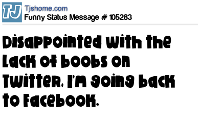 X says Disappointed with the lack of boobs on Twitter, I'm going back to Facebook.