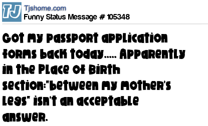 - # 68810 Got my passport application forms back today. Apparently in the Place of Birth section:"between my mother's legs" isn't an acceptable answer!!!