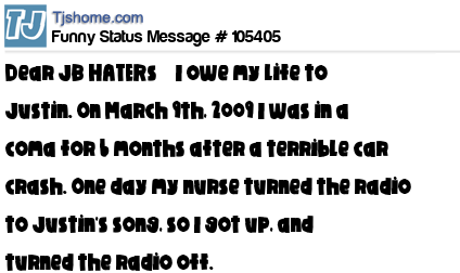 X says Dear JB HATERs – I owe my life to Justin. On March 9th, 2009 I was in a coma for 6 months after a terrible car crash. One day my nurse turned the radio to Justin's song, so I got up, and turned the radio off.