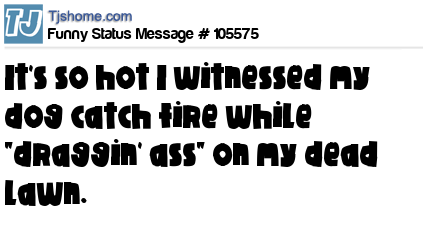 X It's so hot I witnessed my dog catch fire while "draggin' ass" on my dead lawn.