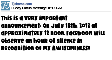X says This is a very important announcement: On July 18th, 2012 at approximately 12 noon, Facebook will observe an hour of silence in recognition of my AWESOMENESS!