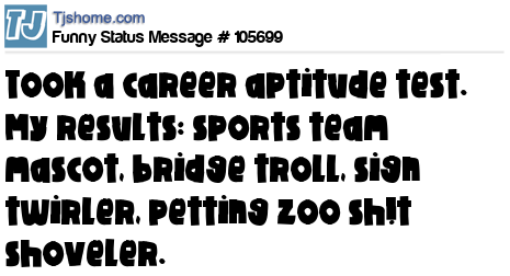 - # 105759 Took a career aptitude test. My results: sports team mascot, bridge troll, sign twirler, petting zoo poop scooper..