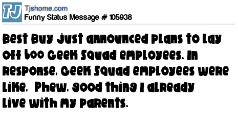 X is Best Buy just announced plans to lay off 600 Geek Squad employees. In response, Geek Squad employees were like, “Phew, good thing I already live with my parents.”