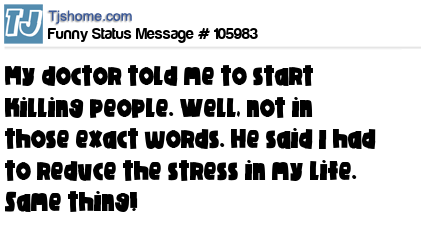 - # 165371 My doctor told me to start killing people....well not exactly in those words. He said I need to reduce stress in my life.