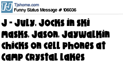 X is J - July, Jocks in ski masks, Jason, Jaywalkin chicks on cell phones at Camp Crystal Lakes