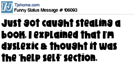 X Just got caught stealing a book, I explained that I'm dyslexic & thought it was the 'help self' section.