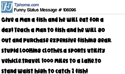 X is Give a man a fish and he will eat for a day! Teach a man to fish and he will go out and purchase expensive fishing gear, stupid looking clothes,a sports utility vehicle,travel 1000 miles to a lake,to stand waist high to catch 2 fish!