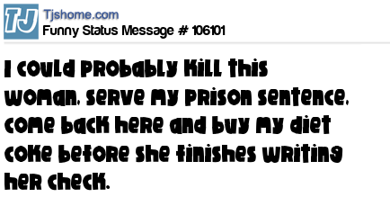 X I could probably kill this woman, serve my prison sentence, come back here and buy my diet coke before she finishes writing her check.