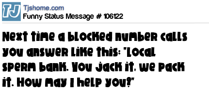 X is Next time a blocked number calls you answer like this: "Local sperm bank. You jack it, we pack it. How may I help you?"