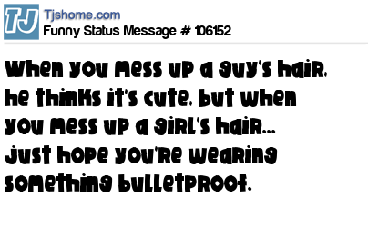 - # 131679 When you mess up a guy’s hair, he thinks it’s cute, but when you mess up a girl’s hair, just hope you’re wearing something bulletproof.