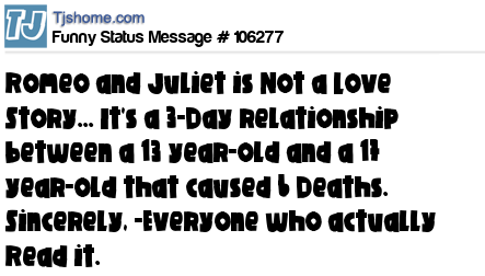 X Romeo and Juliet is Not a Love Story... It's a 3-Day relationship between a 13 year-old and a 17 year-old that caused 6 Deaths. Sincerely, -Everyone who actually Read it.