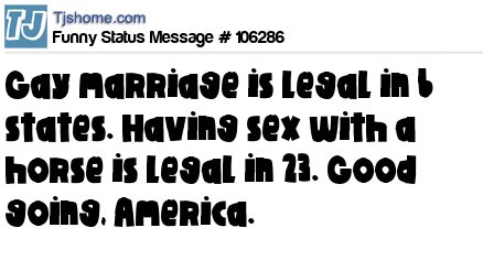 X is Gay marriage is legal in 6 states. Having sex with a horse is legal in 23. Good going, America.