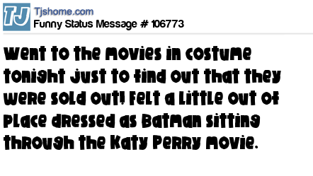 X is Went to the movies in costume tonight just to find out that they were sold out! Felt a little out of place dressed as Batman sitting through the Katy Perry movie.