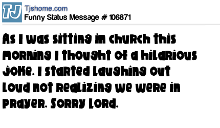 X As I was sitting in church this morning I thought of a hilarious joke. I started laughing out loud not realizing we were in prayer. Sorry Lord.