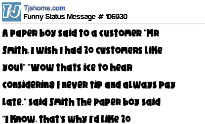X is A paper boy said to a customer ''Mr Smith, I wish I had 20 customers like you!'' ''Wow thats ice to hear considering I never tip and always pay late.'' said Smith The paper boy said ''I know, that's why I'd like 20 customers like you, I have 150 right now