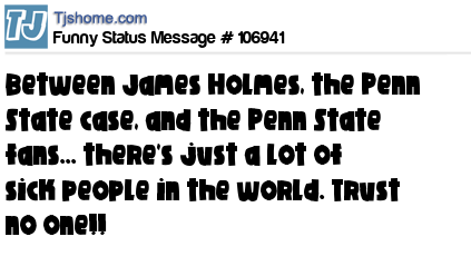 X says Between James Holmes, the Penn State case, and the Penn State fans... there's just a lot of sick people in the world. Trust no one!!
