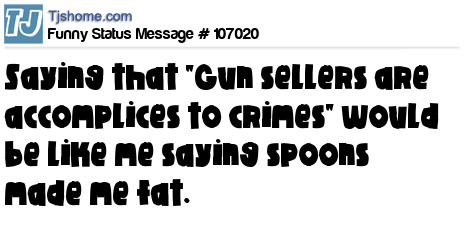 X is Saying that "Gun sellers are accomplices to crimes" would be like me saying spoons made me fat.
