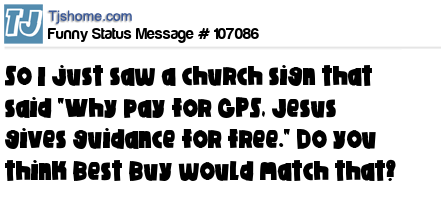 X says So I just saw a church sign that said "Why pay for GPS, Jesus gives guidance for free." Do you think Best Buy would match that?