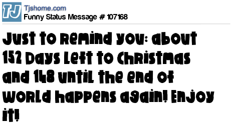 X is Just to remind you: about 152 Days left to Christmas and 148 until the end of world happens again! Enjoy it!