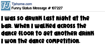 X I was so drunk last night at the bar. When I walked across the dance floor to get another drink I won the dance competition.