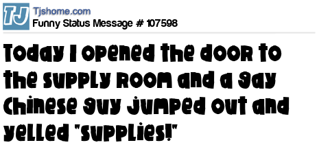 X says Today I opened the door to the supply room and a gay Chinese guy jumped out and yelled "supplies!"