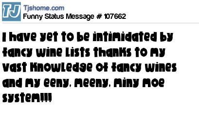 X is I have yet to be intimidated by fancy wine lists thanks to my vast knowledge of fancy wines and my eeny, meeny, miny moe system!!!
