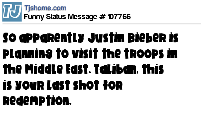 X So apparently Justin Bieber is planning to visit the troops in the Middle East. Taliban, this is your last shot for redemption.
