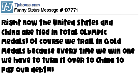 X is Right now the United States and China are tied in total Olympic medals! Of course we trail in Gold medals because every time we win one we have to turn it over to China to pay our debt!!!