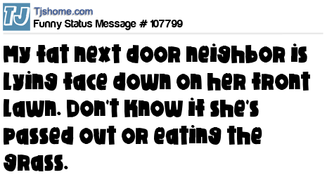 X says My fat next door neighbor is lying face down on her front lawn. Don't know if she's passed out or eating the grass.