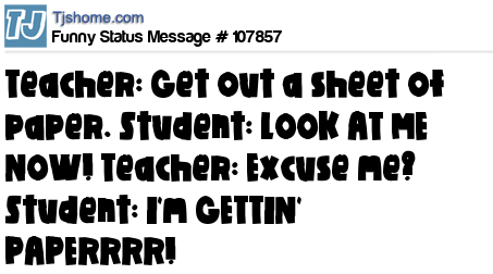 X is Teacher: Get out a sheet of paper. Student: LOOK AT ME NOW! Teacher: Excuse me? Student: I'm GETTIN' PAPERRRR!