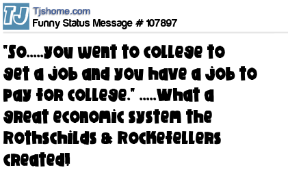 X "So.....you went to college to get a job and you have a job to pay for college." .....What a great economic system the Rothschilds & Rockefellers created!