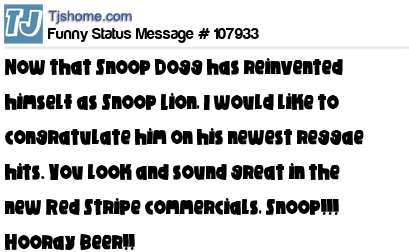X Now that Snoop Dogg has reinvented himself as Snoop Lion, I would like to congratulate him on his newest reggae hits. You look and sound great in the new Red Stripe commercials, Snoop!!! Hooray Beer!!