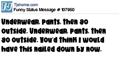 X says Underwear, pants, then go outside. Underwear, pants, then go outside. You'd think I would have this nailed down by now.