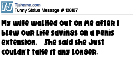 X My wife walked out on me after I blew our life savings on a penis extension. She said she just couldn't take it any longer.