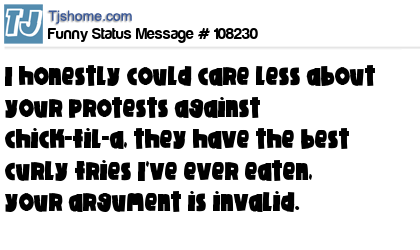 X is I honestly could care less about your protests against chick-fil-a, they have the best curly fries I've ever eaten, your argument is invalid.