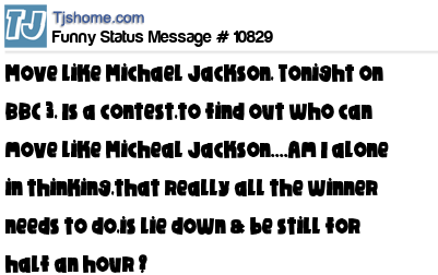 X is Move like Michael Jackson, Tonight on BBC 3, Is a contest,to find out who can move like Micheal Jackson....Am I alone in thinking,that really all the winner needs to do,is lie down & be still for half an hour ?