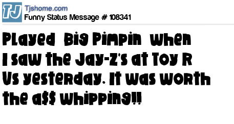 X says Played “Big Pimpin” when I saw the Jay-Z's at Toy R Us yesterday. It was worth the a$$ whipping!!