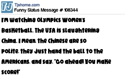 X I'm watching Olympics Women's Basketball. The USA is slaughtering China. I mean, the Chinese are so polite, they just hand the ball to the Americans, and say, "Go ahead! You make score!"