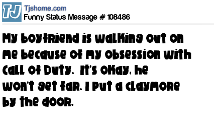 - # 80680 My girlfriend is walking out on me because of my obsession with Call of Duty. It's ok, she wont get far. I set up a claymore by the door.