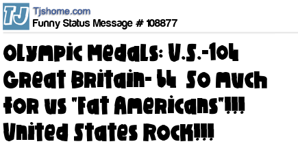 X Olympic Medals: U.S.-104 Great Britain- 64 So much for us "Fat Americans"!!! United States Rock!!!